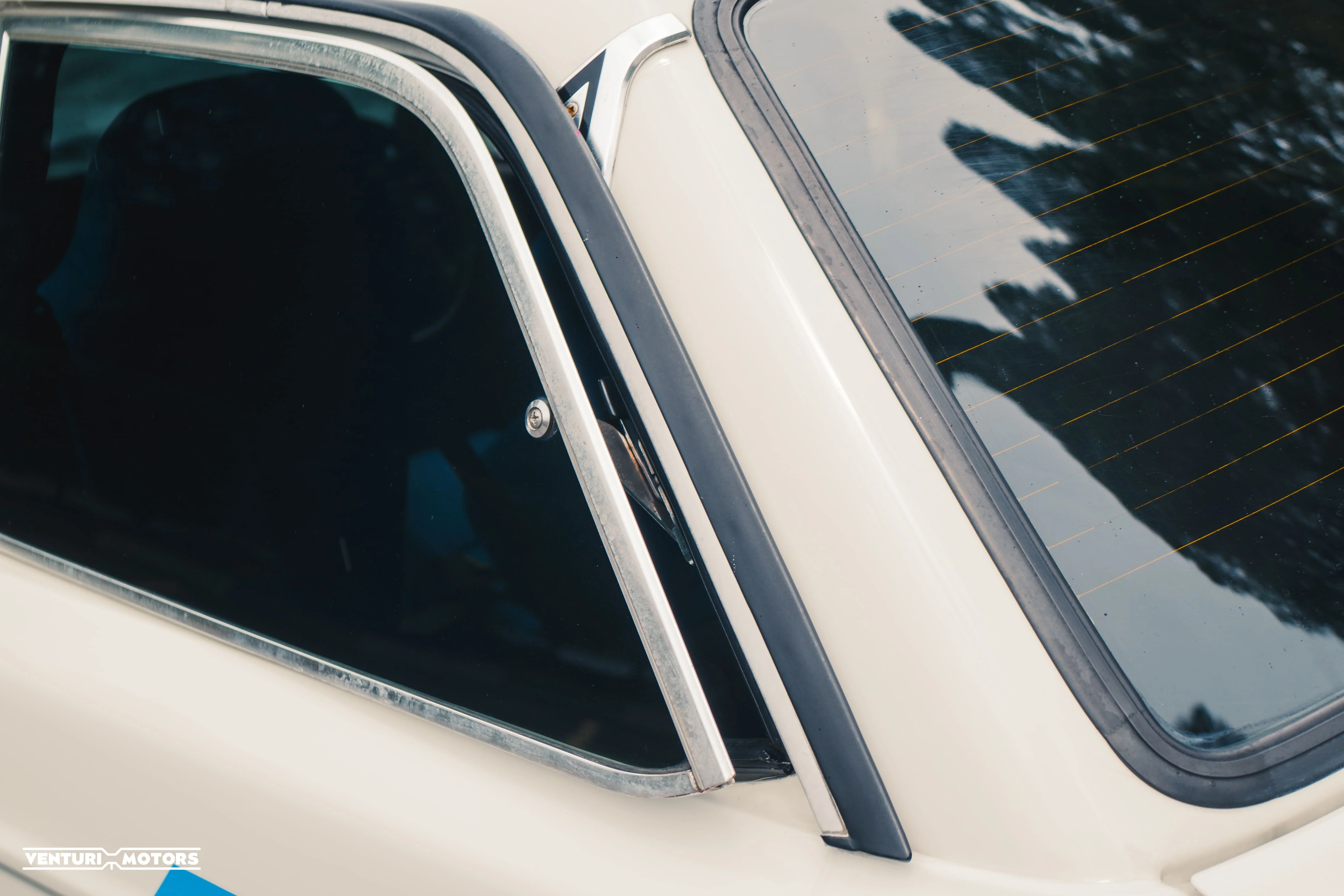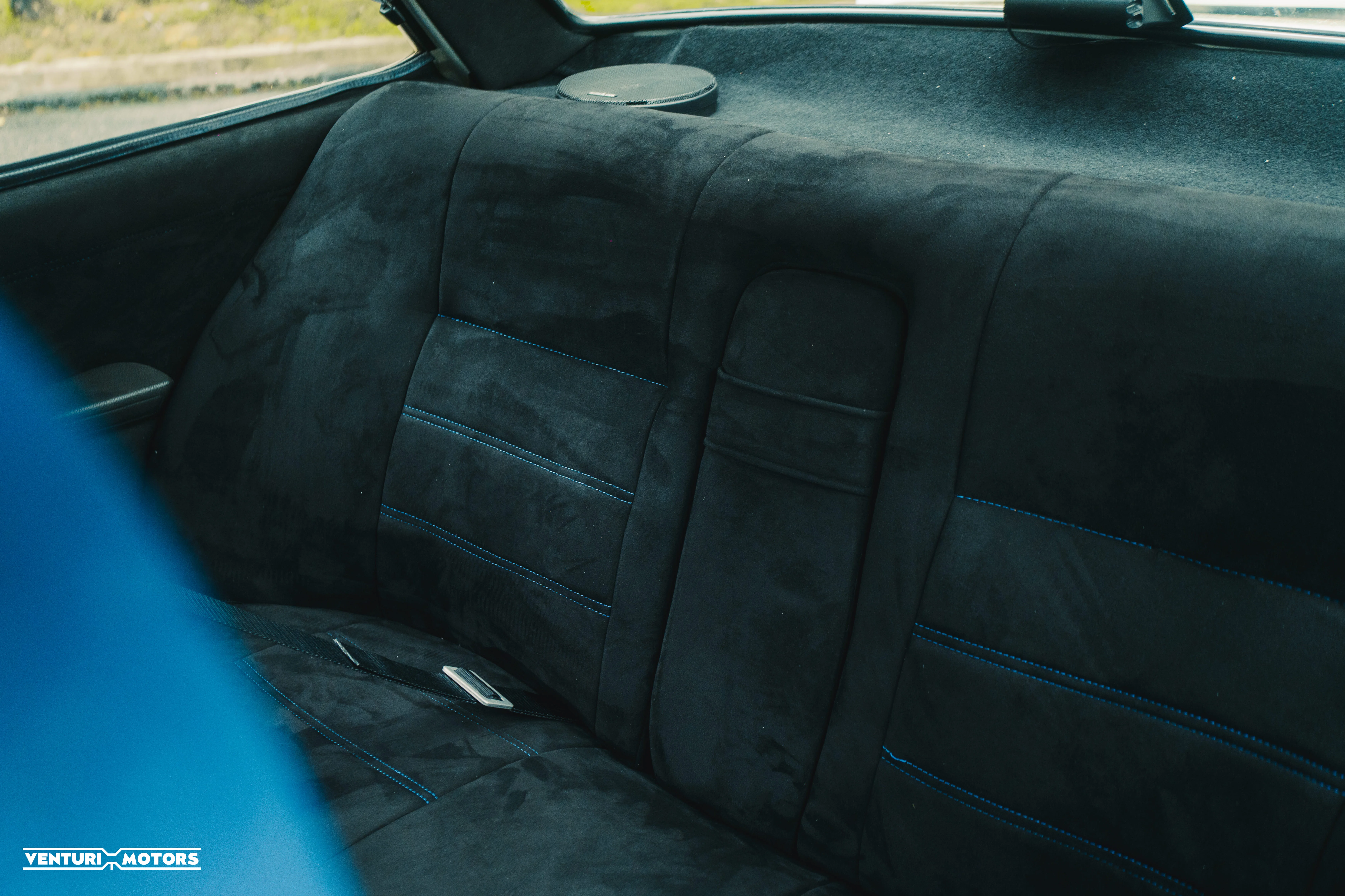 Step inside and it’s a mix of restored originality and modern comfort. The cabin has been reupholstered in Alcantara, contrasted with a pair of Recaro SR3 seats in blue, giving the 242 a subtle touring-car cockpit vibe without losing its classic charm. The original head unit remains, keeping a slice of the ’70s intact.