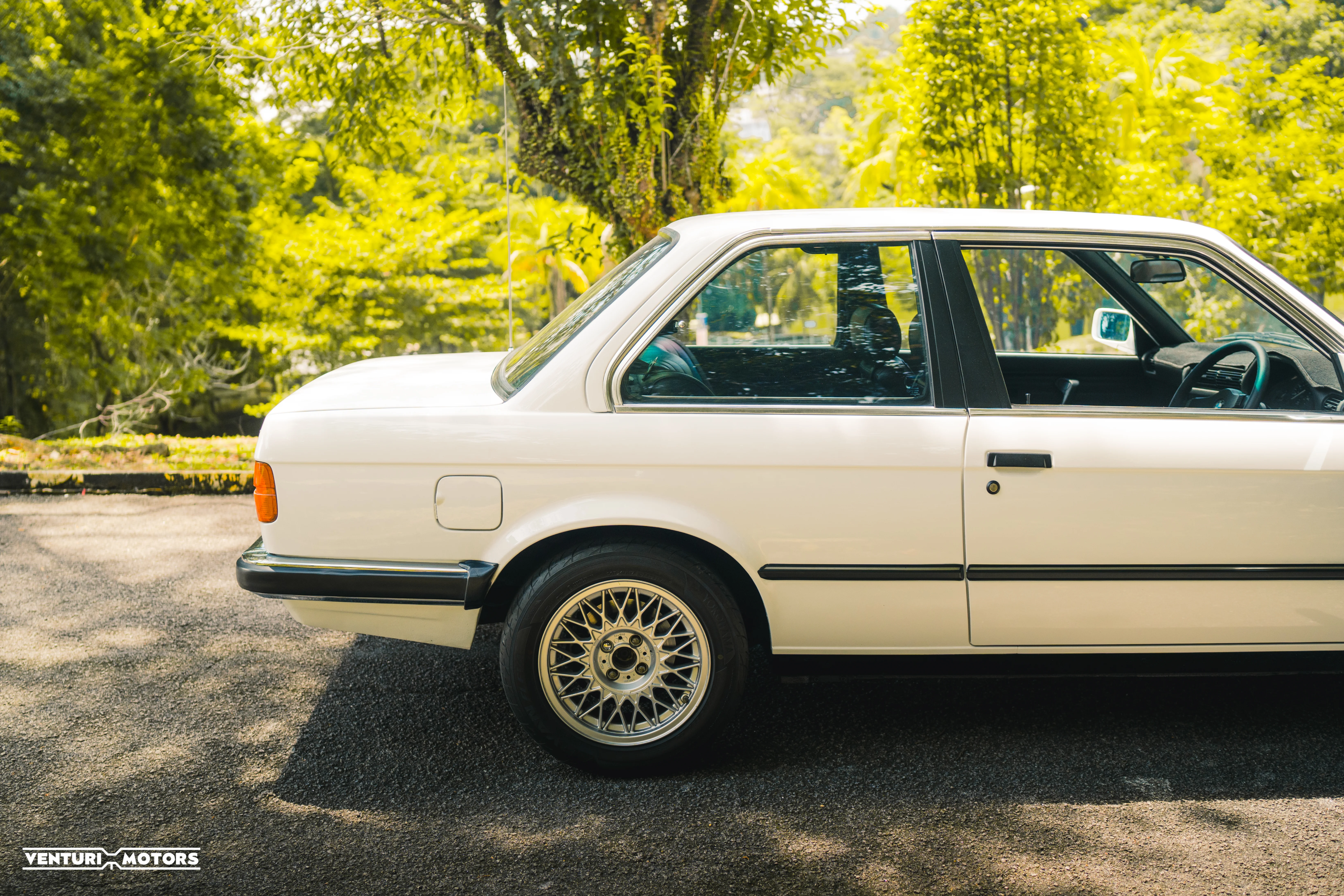 This particular example is a 1984 BMW E30 323i Coupe, finished in freshly repainted Alpine White I—a classic BMW shade that brings crisp contrast to its timeless silhouette. Period-correct Style 5 wheels by BBS sit under its arches, elevating its stance with a subtle touch of motorsport heritage.