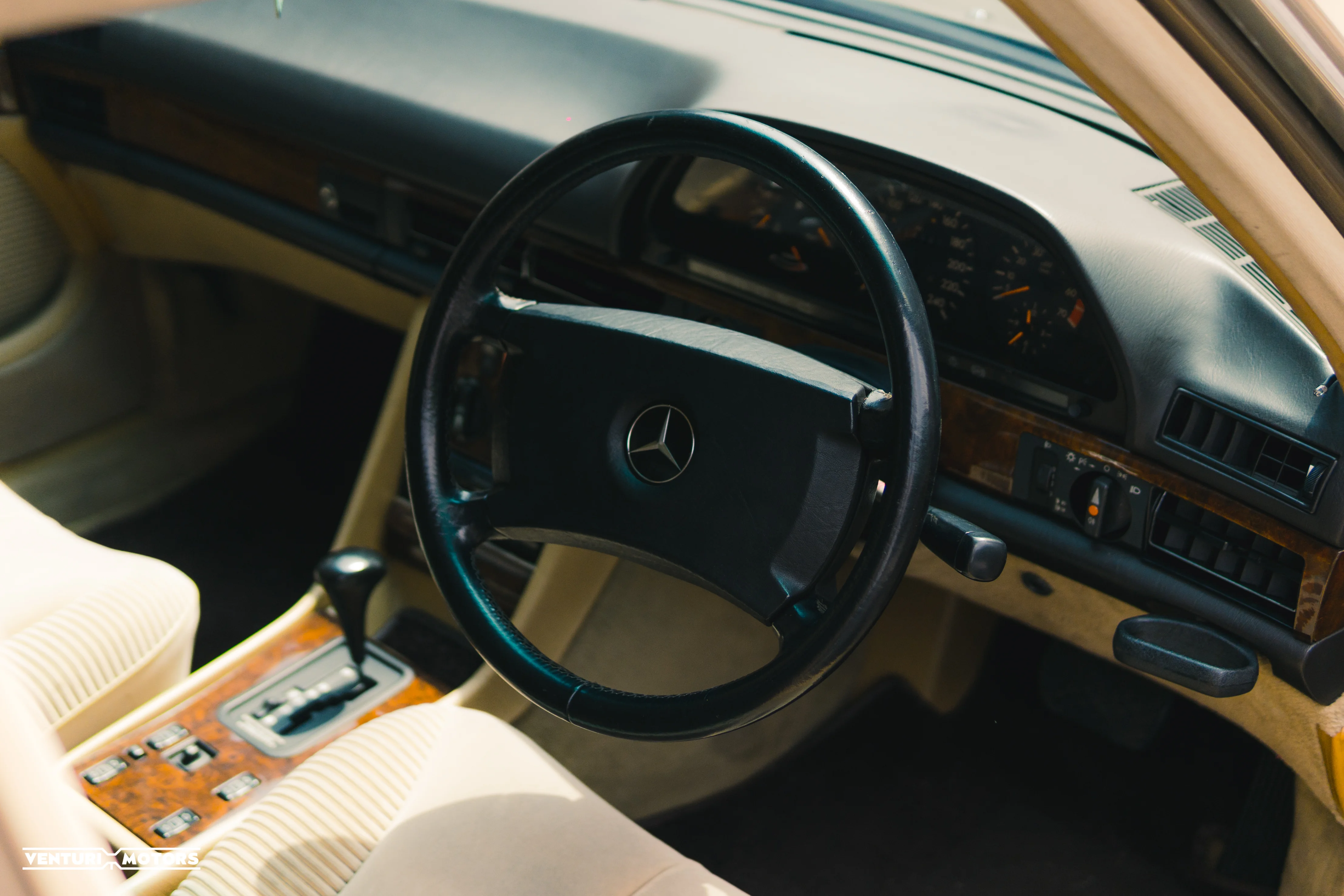 This particular example is a 1990 Mercedes-Benz 300SE, presented in an elegant shade of Champagne Gold, an unmistakably period-correct finish that complements the car’s stately proportions and timeless silhouette. As a fully restored unit, it reflects a level of care and attention that brings the car back to its intended form, preserving the essence of what made the W126 an icon.