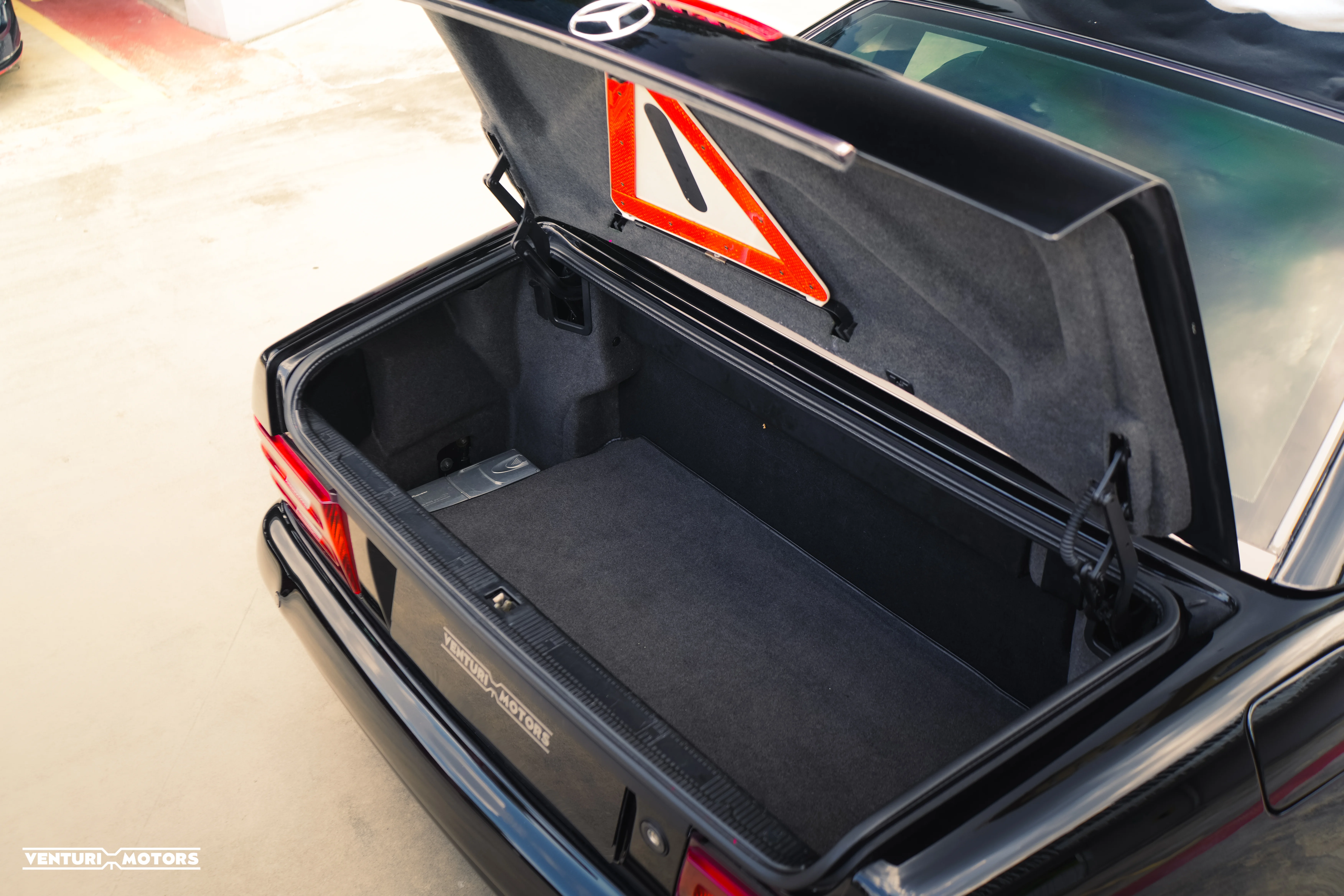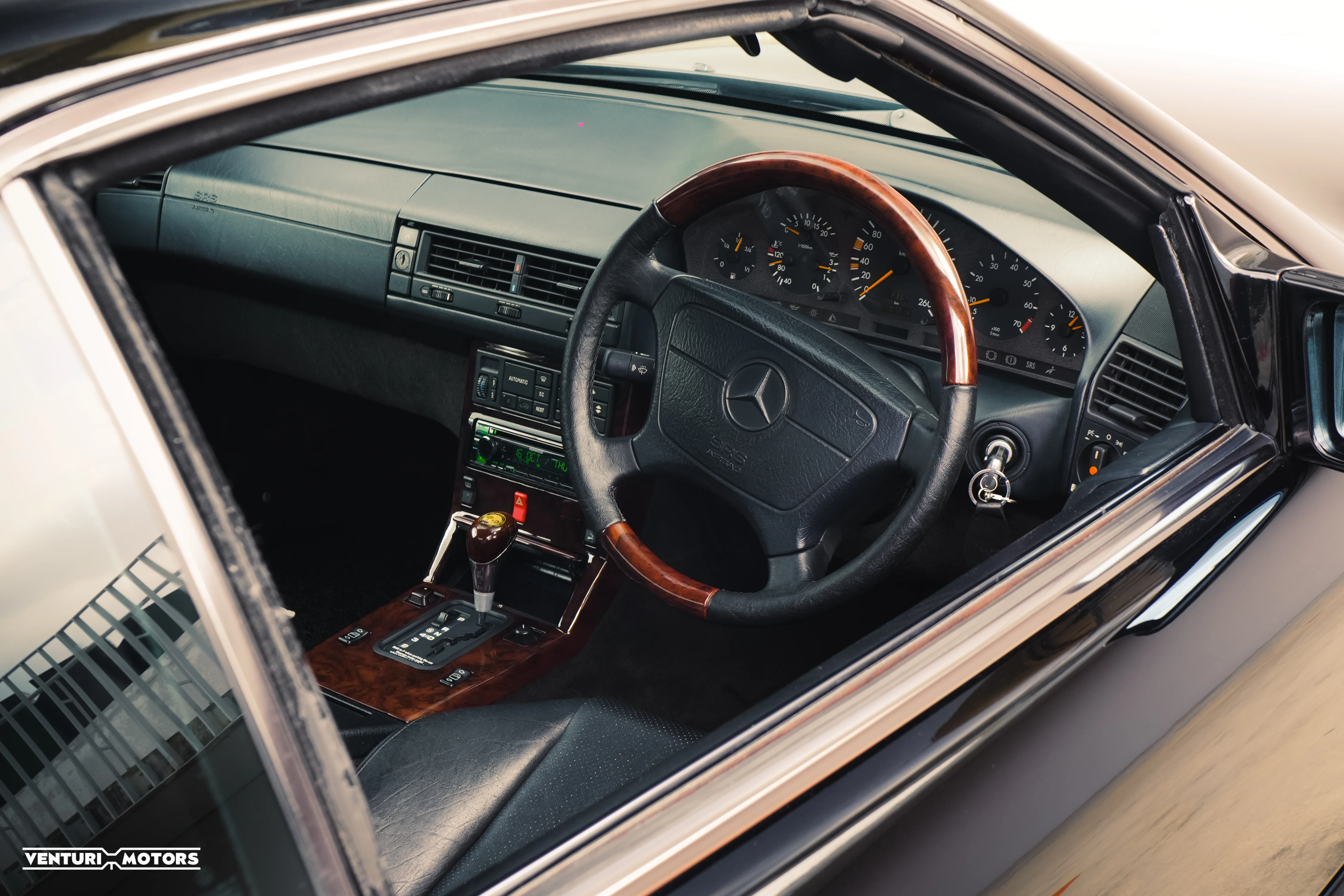 Inside, the cabin is finished in black leather paired with polished wood trims—an unmistakable hallmark of Mercedes-Benz craftsmanship from the 1990s. Every switch, contour, and surface evokes the tactile precision of Stuttgart’s finest era.