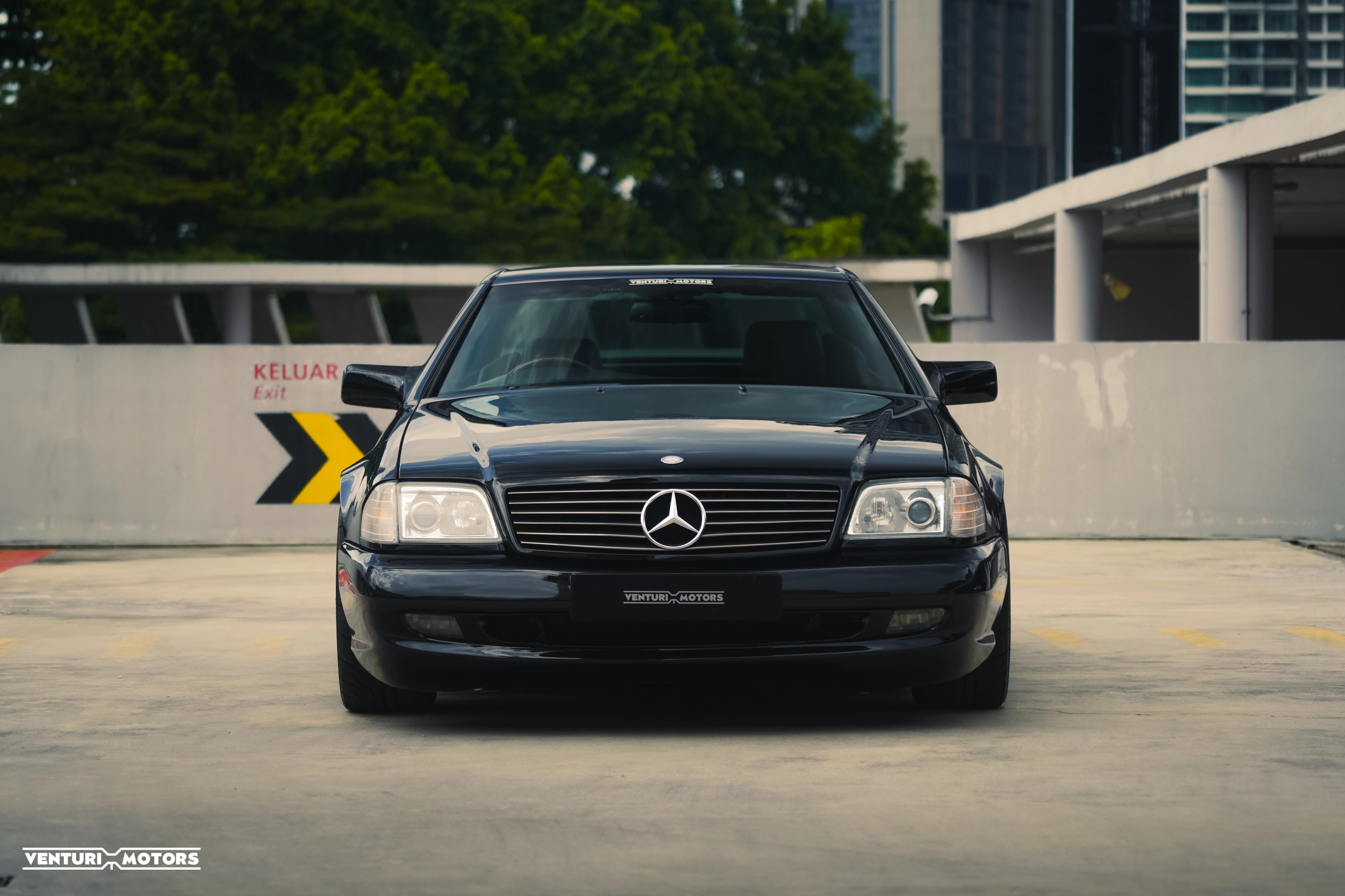 This particular example, a 1996 Mercedes-Benz 320SL, is presented in a deep black finish that accentuates the car’s sculpted, Bruno Sacco–penned lines. The stance is subtly enhanced by a set of period-correct AMG Aero III wheels, lending a tasteful hint of aggression to its otherwise graceful silhouette. Projector headlights complete the exterior, giving it a refined, contemporary presence.