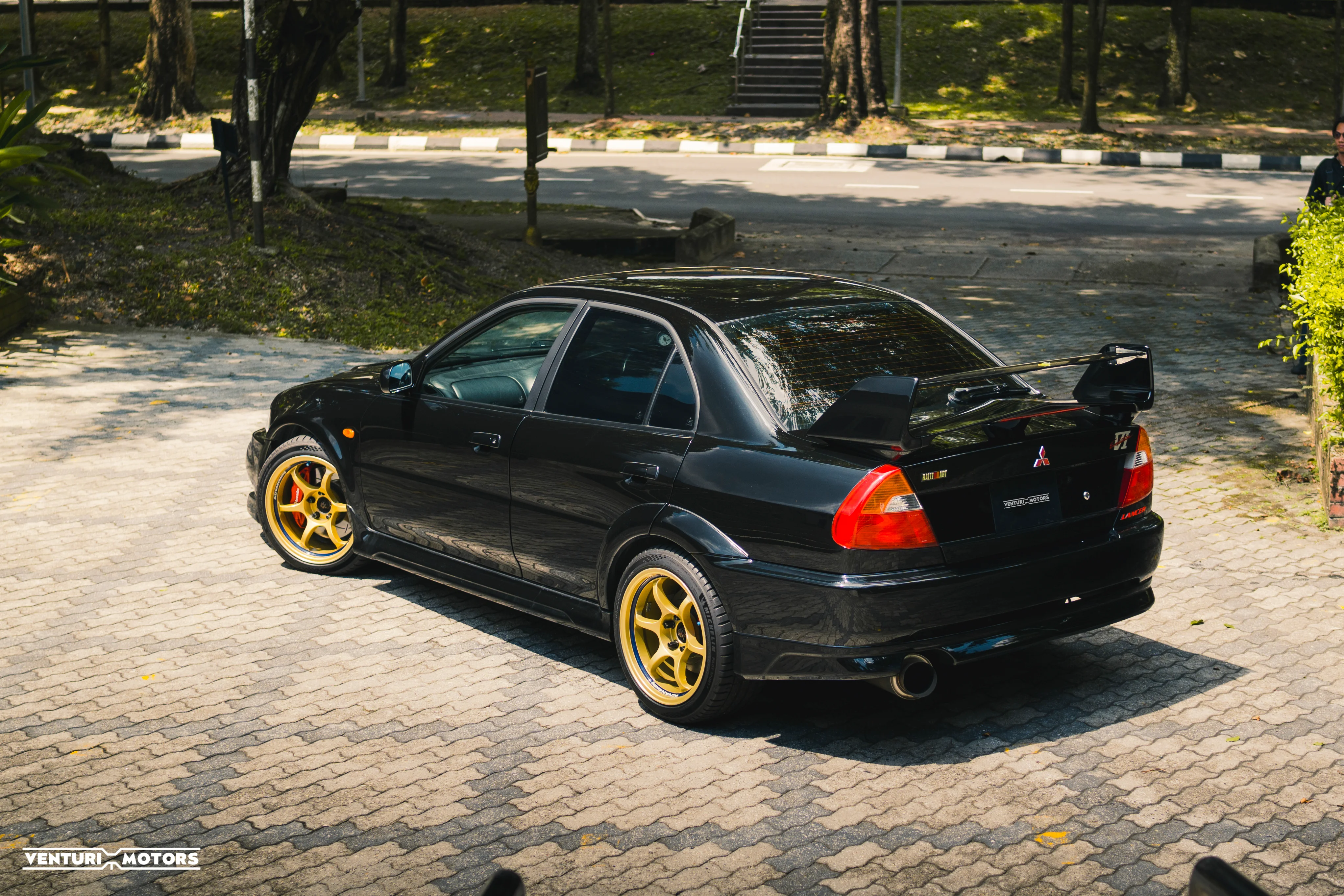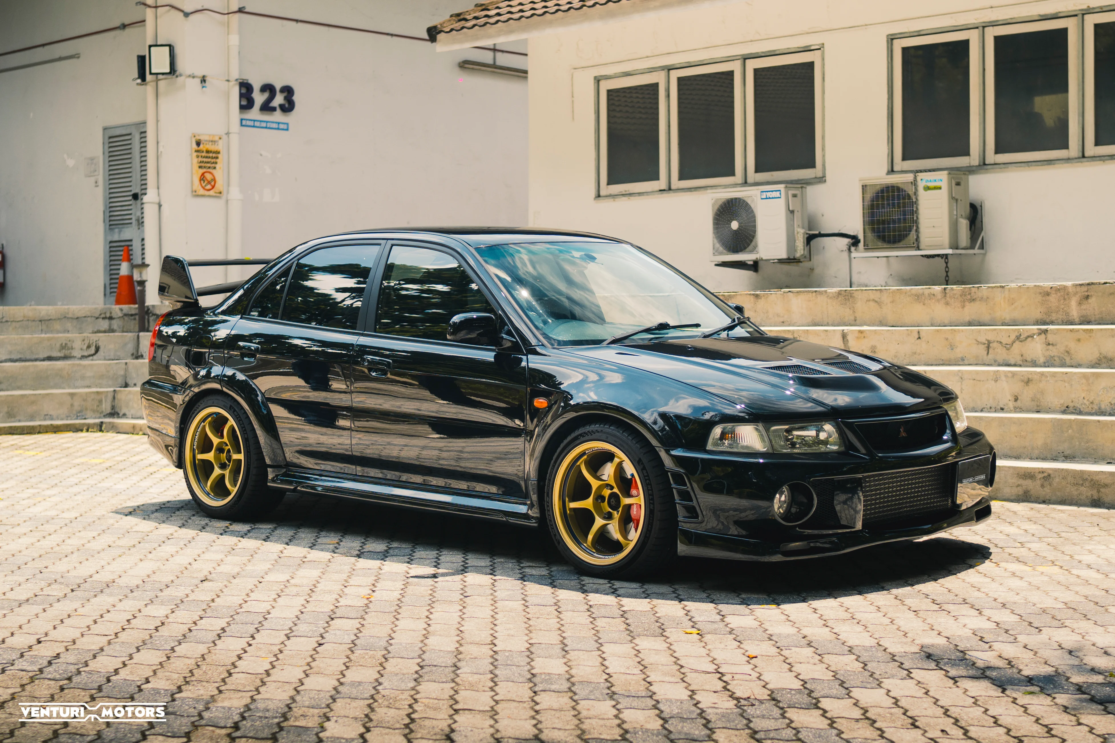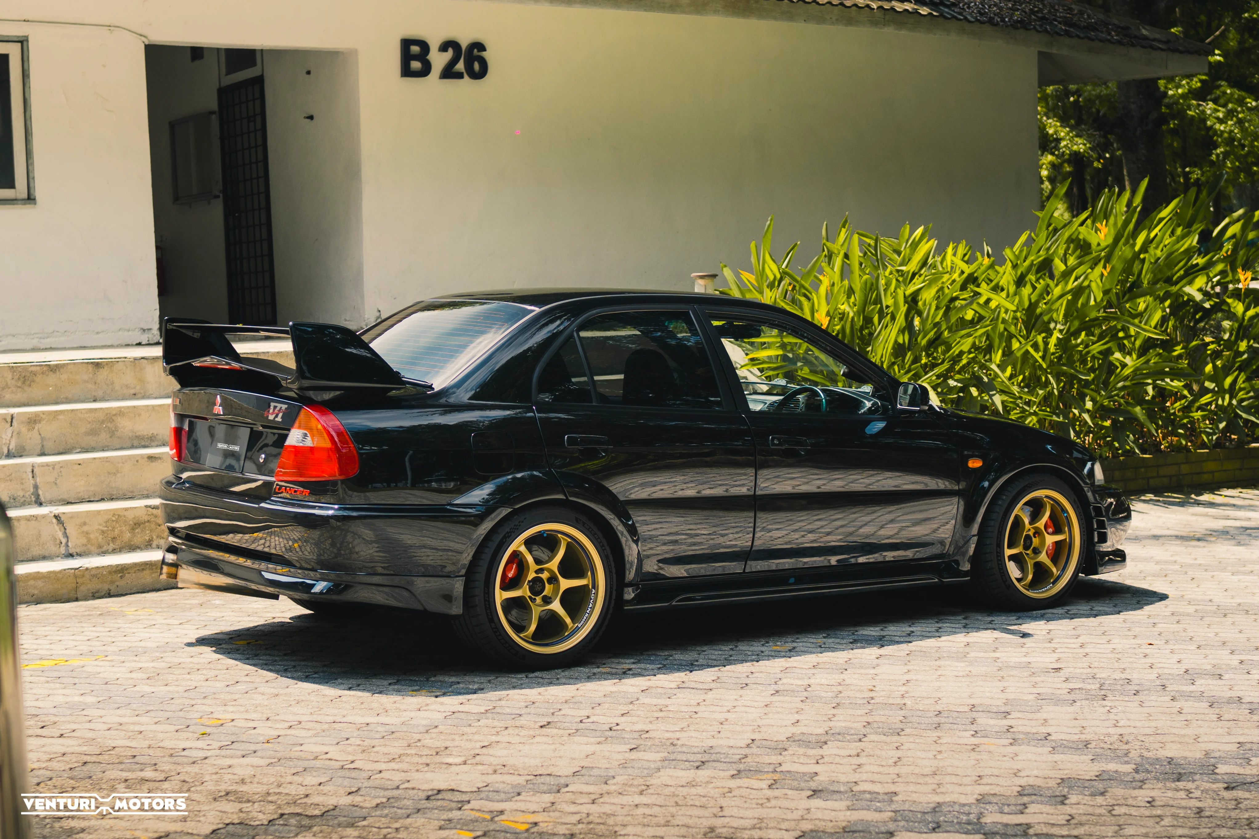 This particular example is a 1999 Evolution VI GSR finished in the rarely-seen Pyrenees Black—a deep, metallic tone that highlights the aggressive lines of the factory widebody and signature rally wing. Sitting on iconic Gold Advan RG wheels,