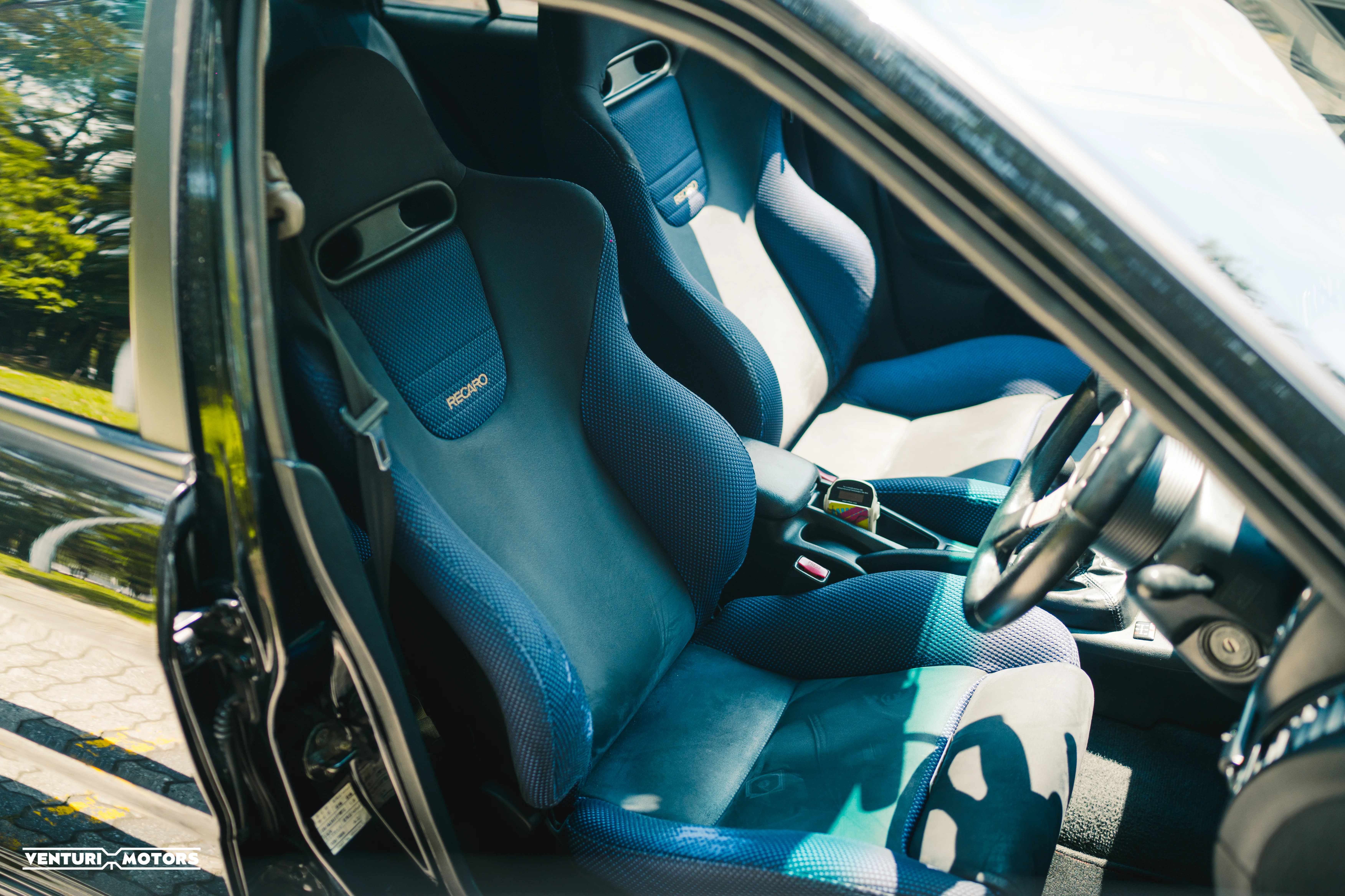 Inside, the cabin retains its authentic character with factory EVO VI blue Recaro semi-bucket seats, a MOMO Racing steering wheel, A-pillar mounted gauges, and minimalist rally-inspired ergonomics—keeping the driver at the centre of the experience.