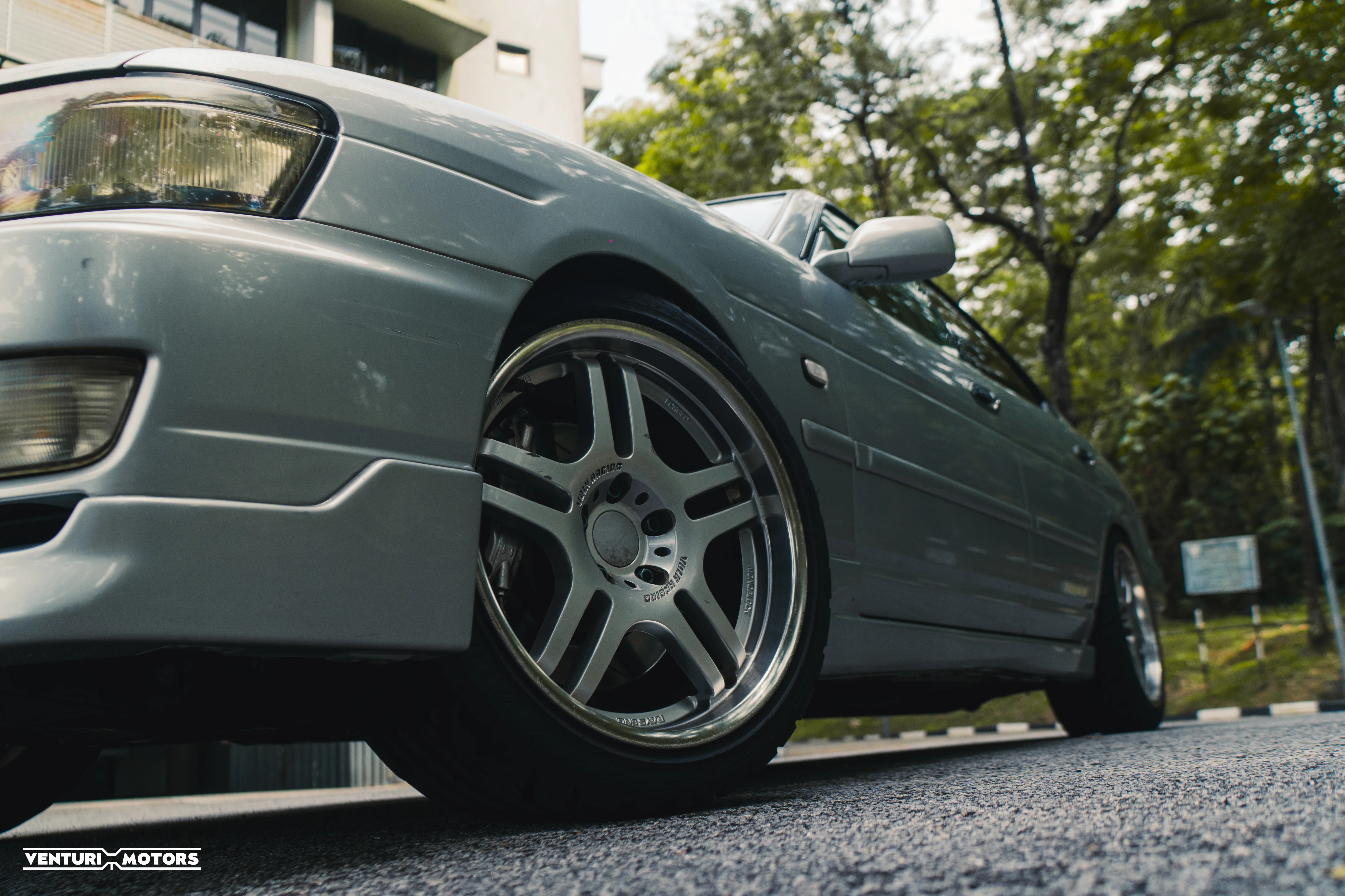 Performance sees a significant step up with a complete swap to the RB25DET NEO, delivering smooth, responsive turbocharged power. The chassis is supported by BC BR coilovers, GK Tech arms, and a brake upgrade featuring Brembo F50 front brakes for confident control.