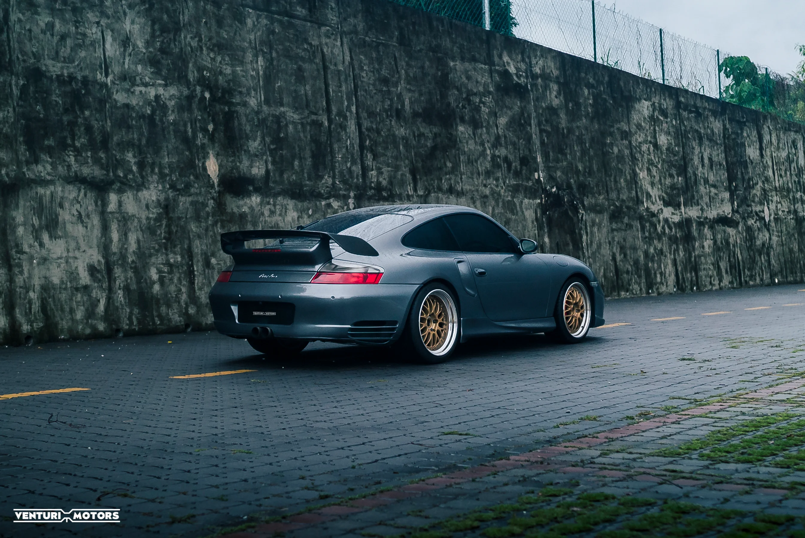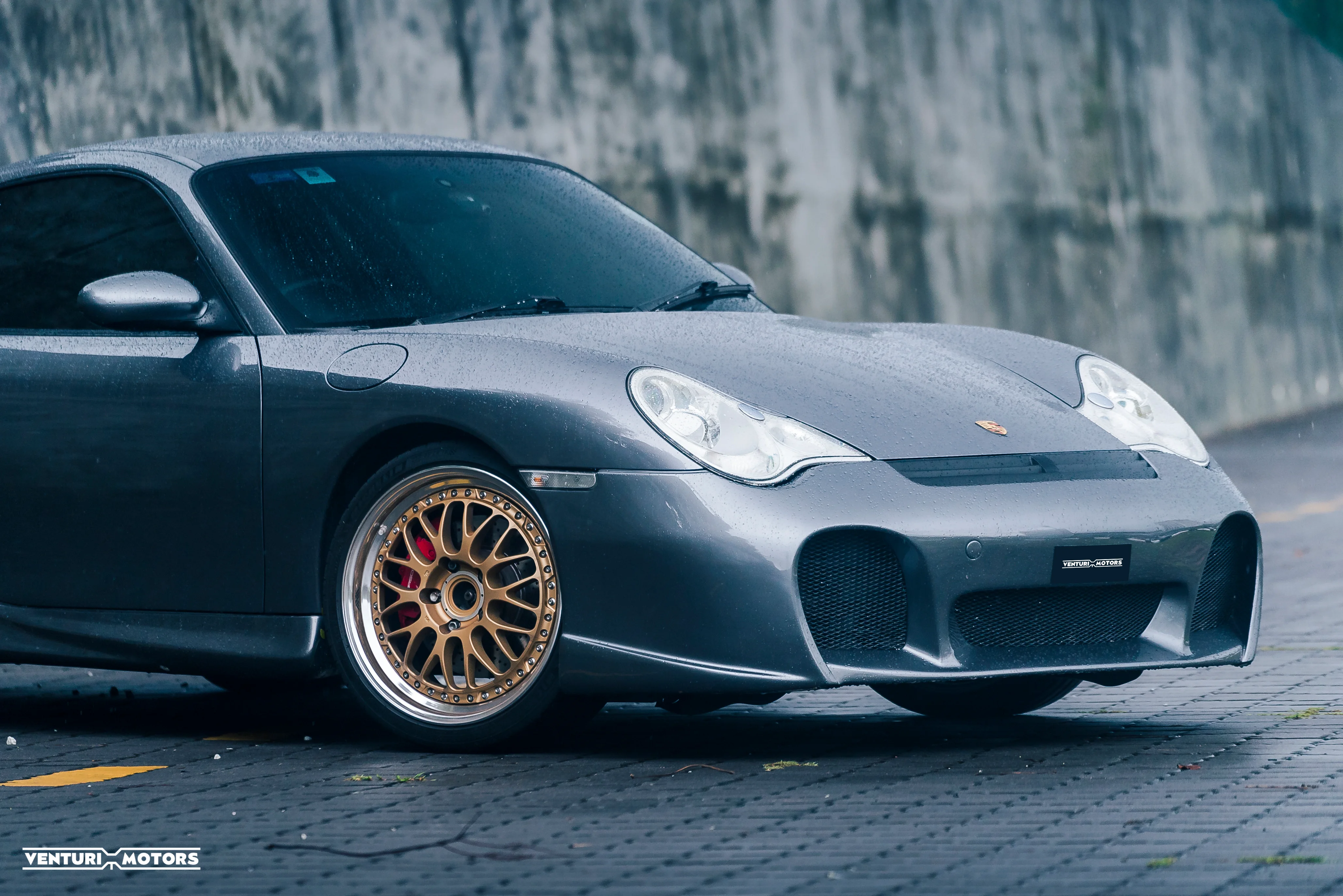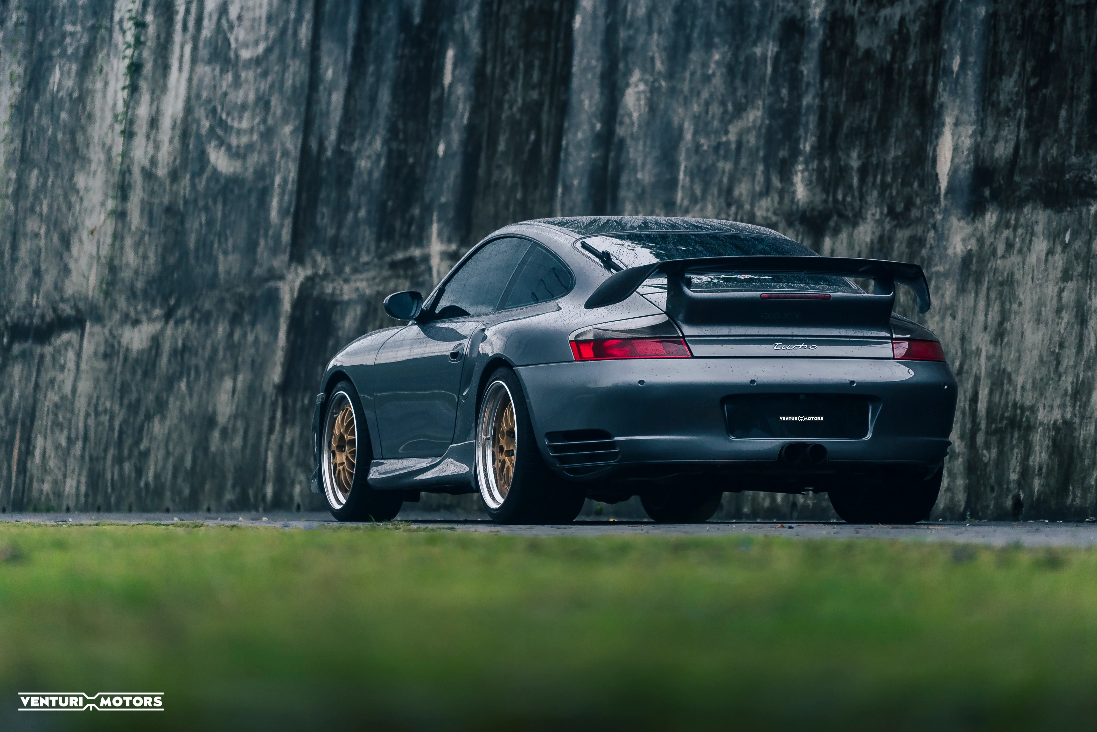 Based on the Carrera 4S, the Turbo boasts wider hips, notably the side pod intake on the rear quarters, channeling air into the M96.70 twin-turbocharged flat-6 engine. Originally delivered by Porsche Malaysia, this 996 has undergone a full Techart treatment. Cloaked in a subtle Seal Grey hue and complemented by a set of gold Work Ekrow C1M wheels, it brings out distinctive character.