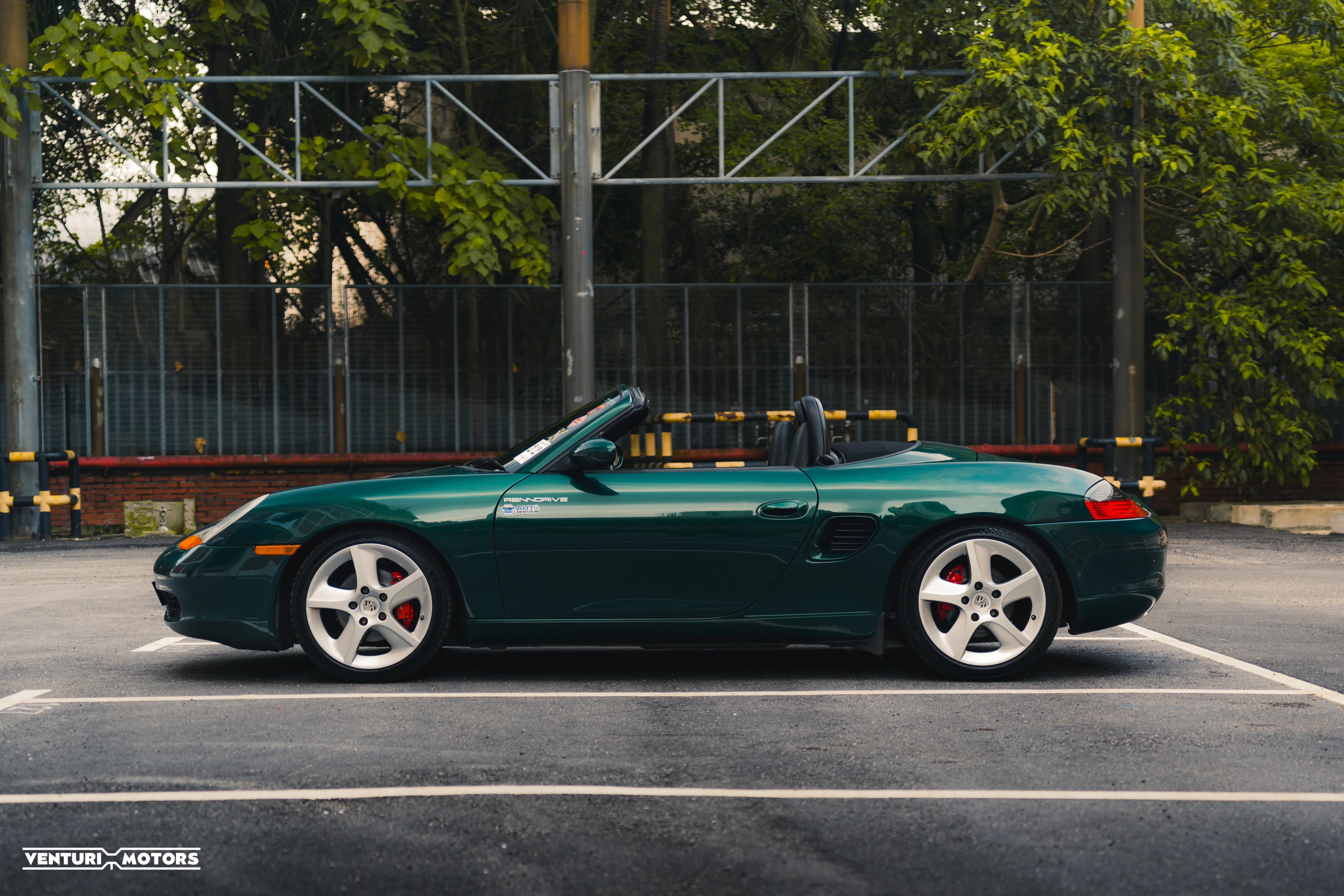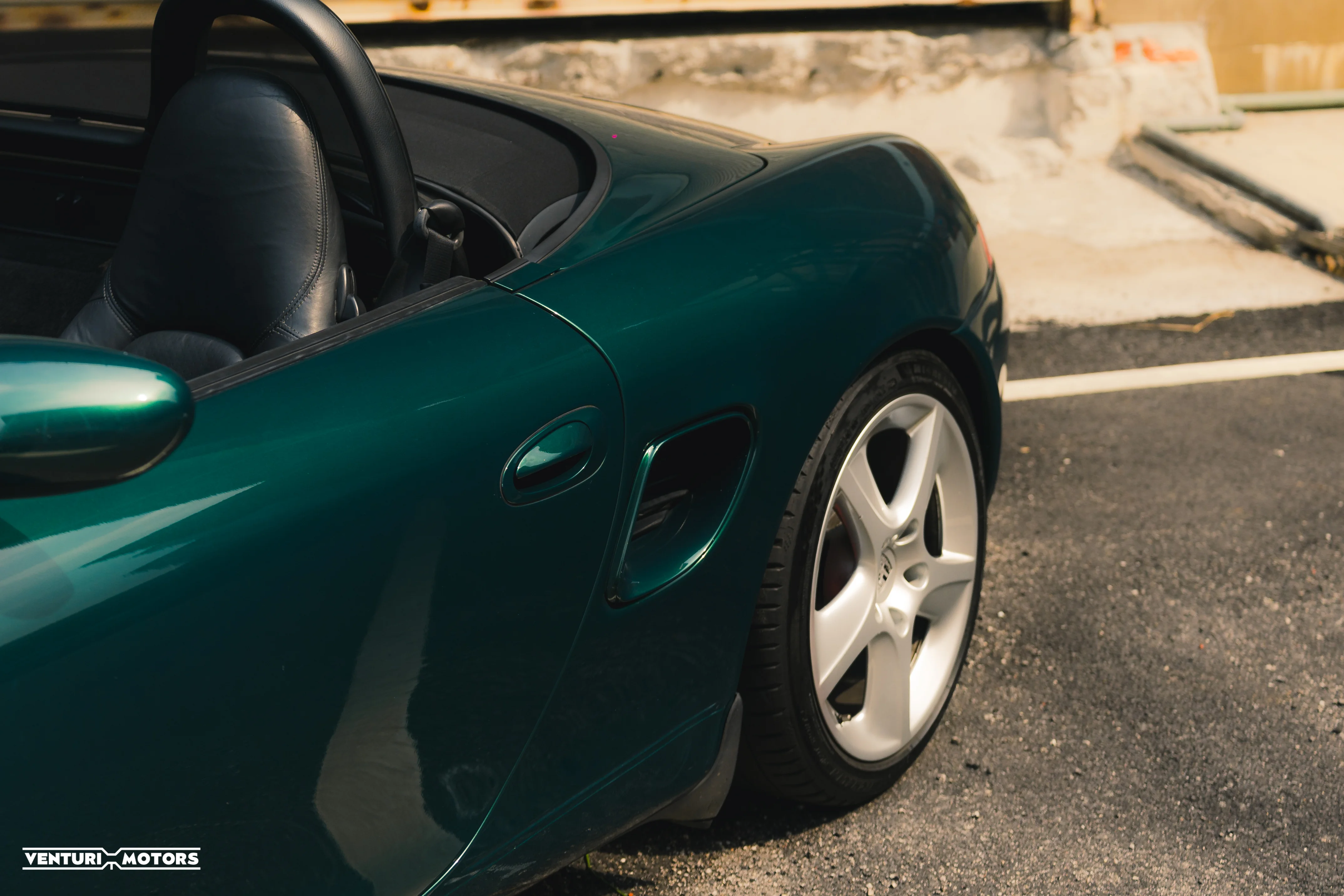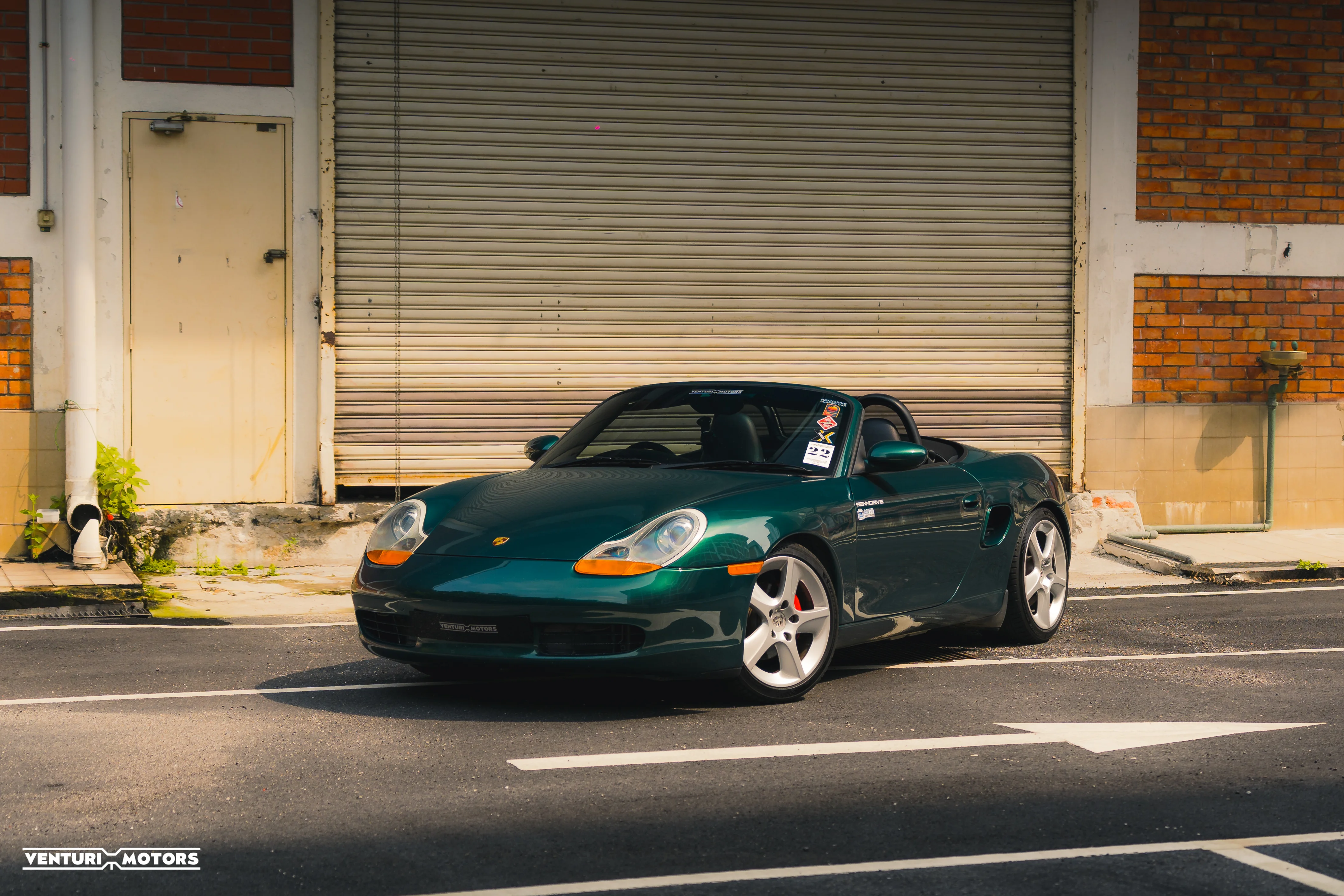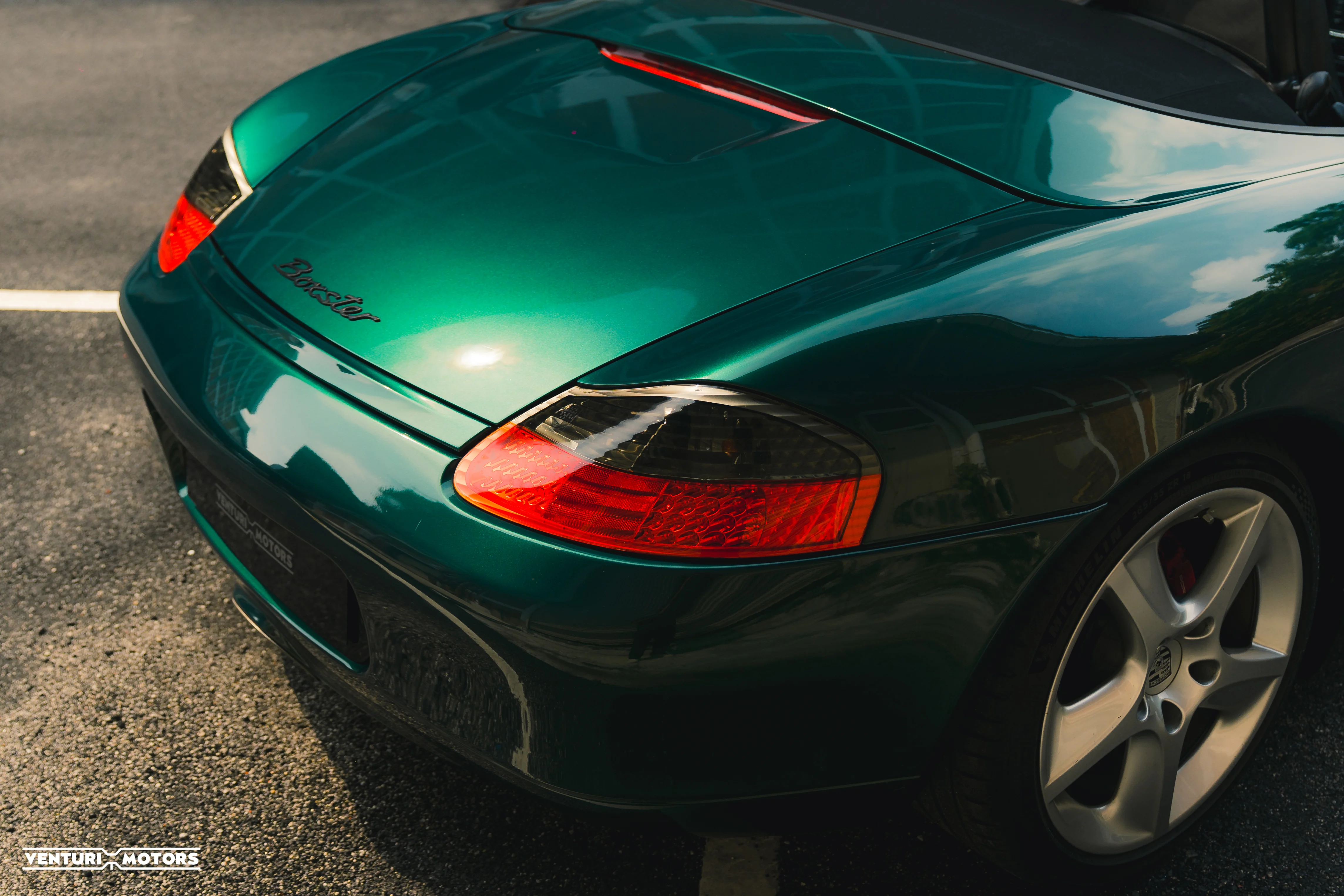 Shown here is a 2003 Porsche 986 Boxster, presented in the elegant and seldom-seen shade of Wimbledon Green, a colour that subtly elevates the car’s timeless silhouette while standing apart from the more conventional palettes seen in the market. Paired with 996 Sport Techno wheels, the overall stance carries a purposeful yet understated presence, echoing Porsche’s design language of the era.