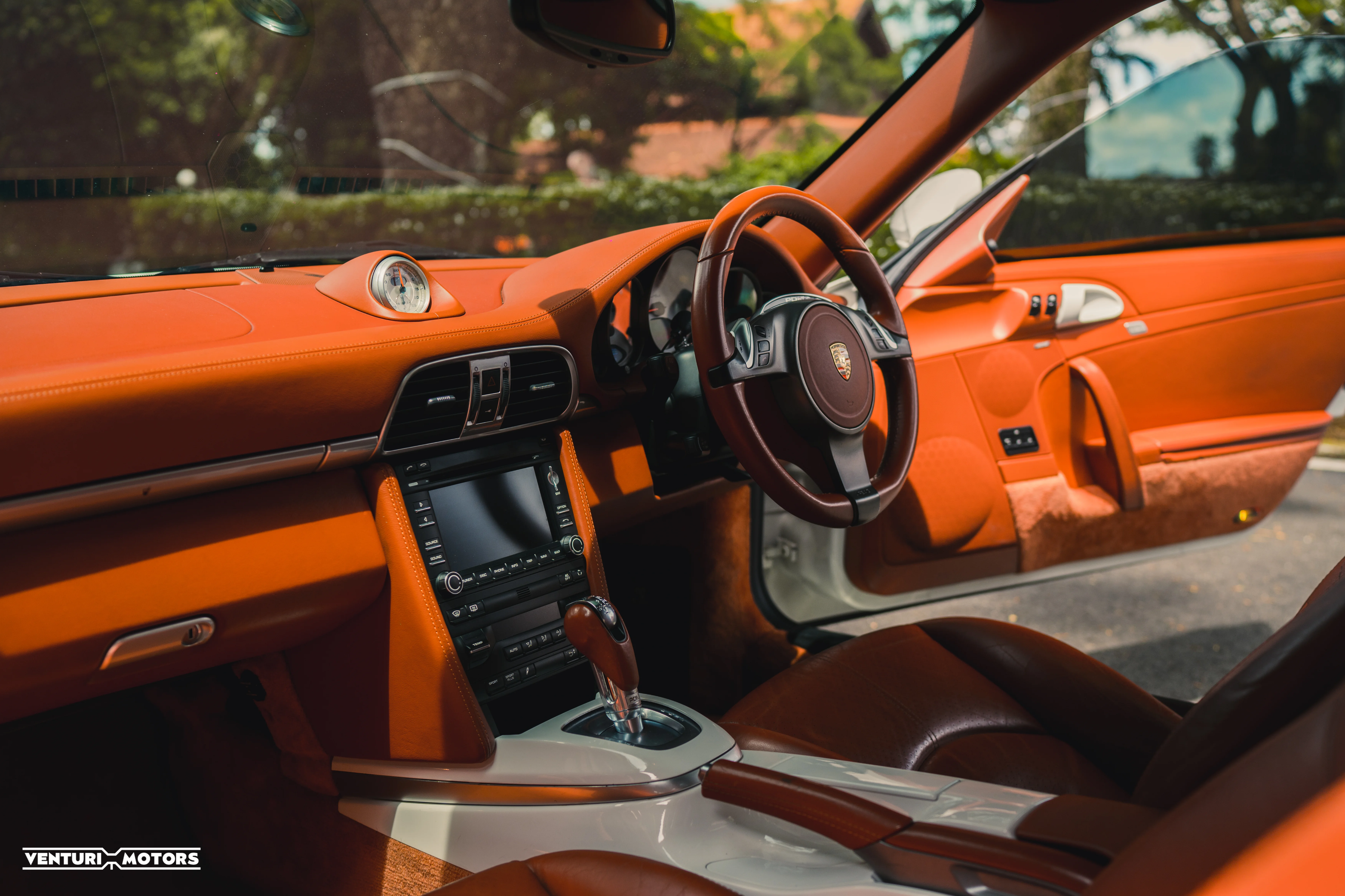 Inside, the full Terracotta leather interior provides a rich contrast, seamlessly complemented by colour-matched trims. The Sport seats offer superb comfort and support, while the multi-function steering wheel with PDK paddles ensures effortless control. The iconic five-dial instrument cluster, with its 350 km/h speedometer, serves as a constant reminder of this car’s staggering capability.