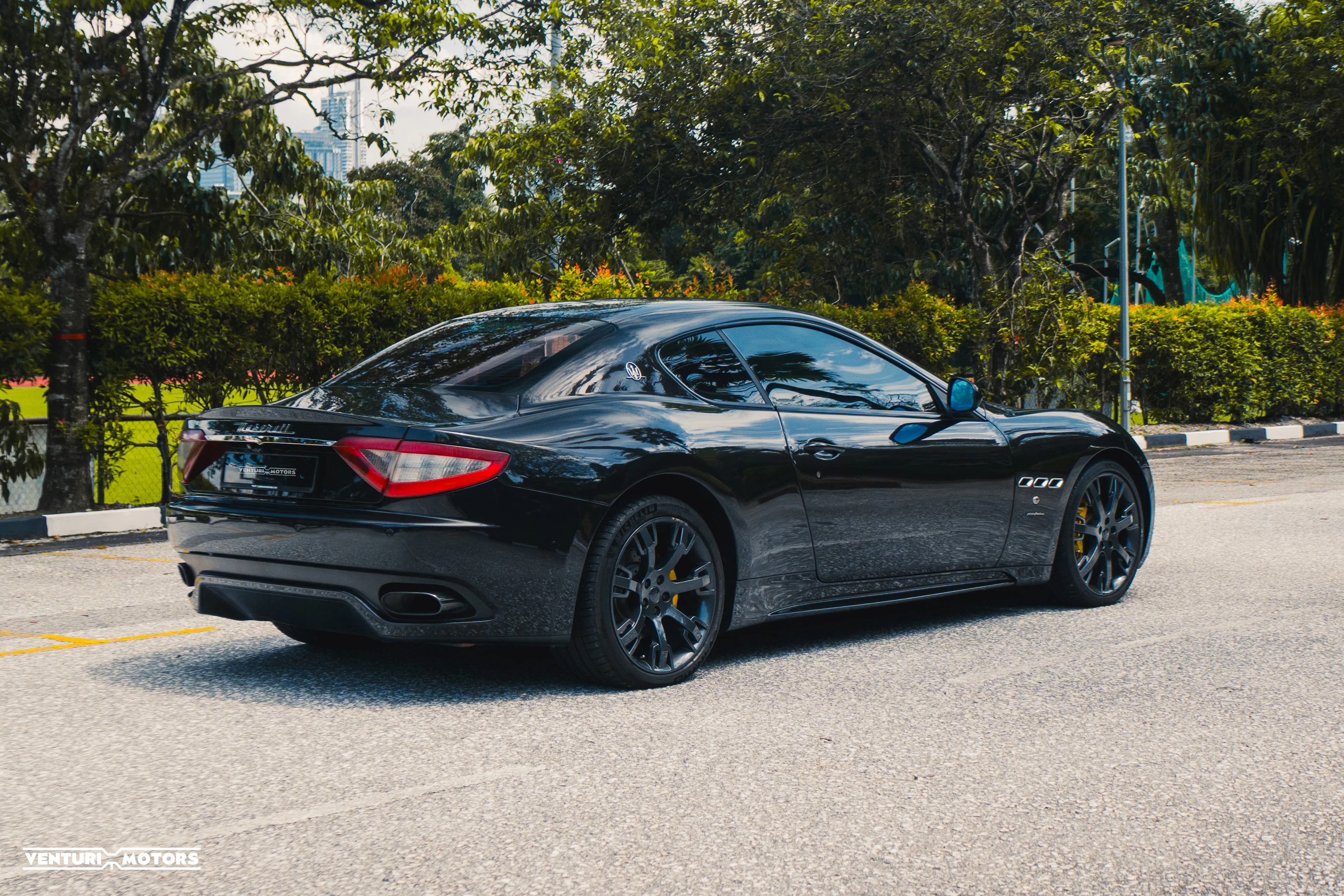 This 2011 example is finished in **Nero Carbonio**, a metallic black that gives the Pininfarina-penned body a darker, more commanding character. The long bonnet, flowing roofline, and sculpted rear haunches come together in proportions that feel timeless rather than trendy. It’s dramatic without exaggeration — unmistakably Italian, unmistakably Maserati.