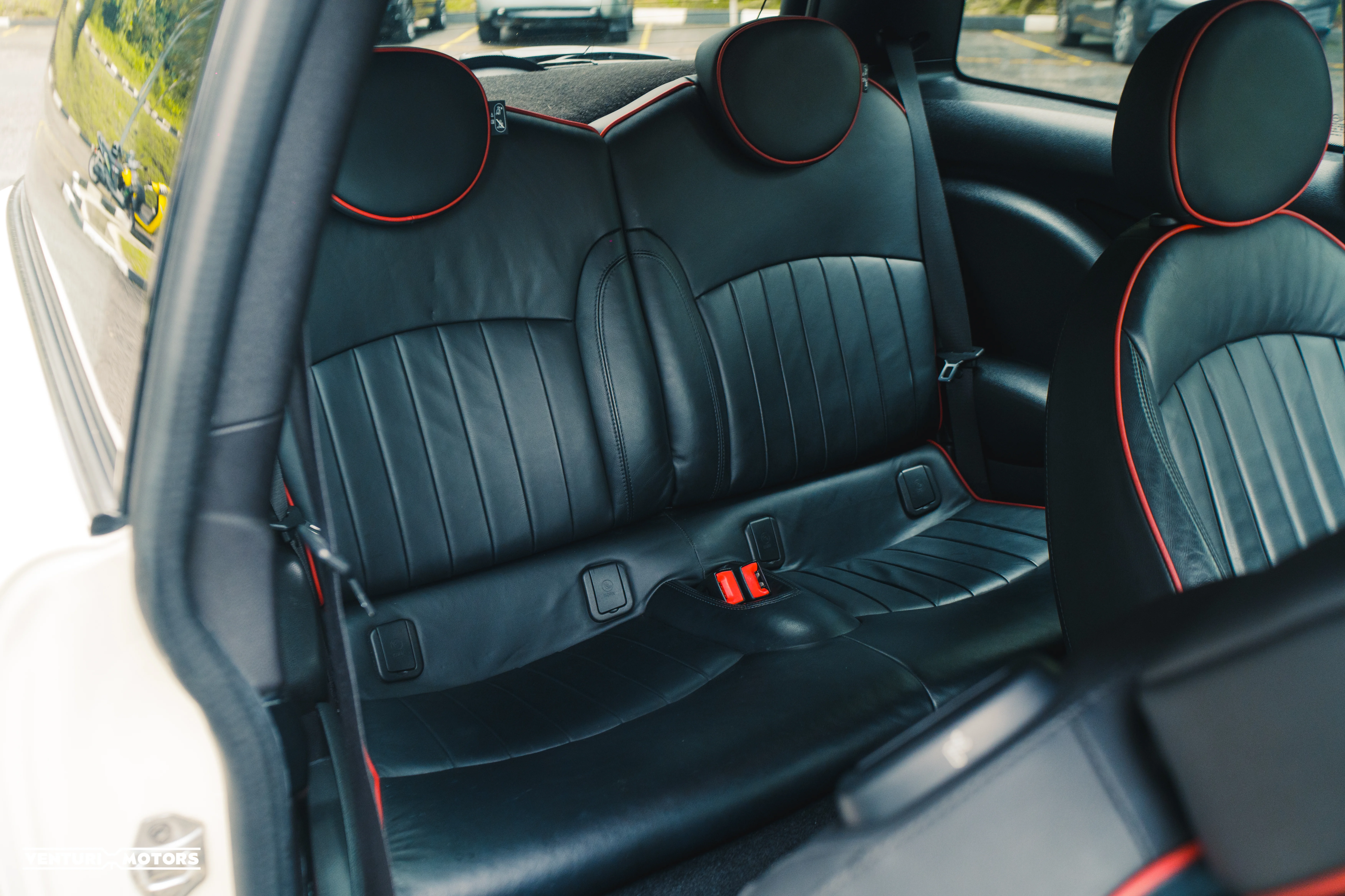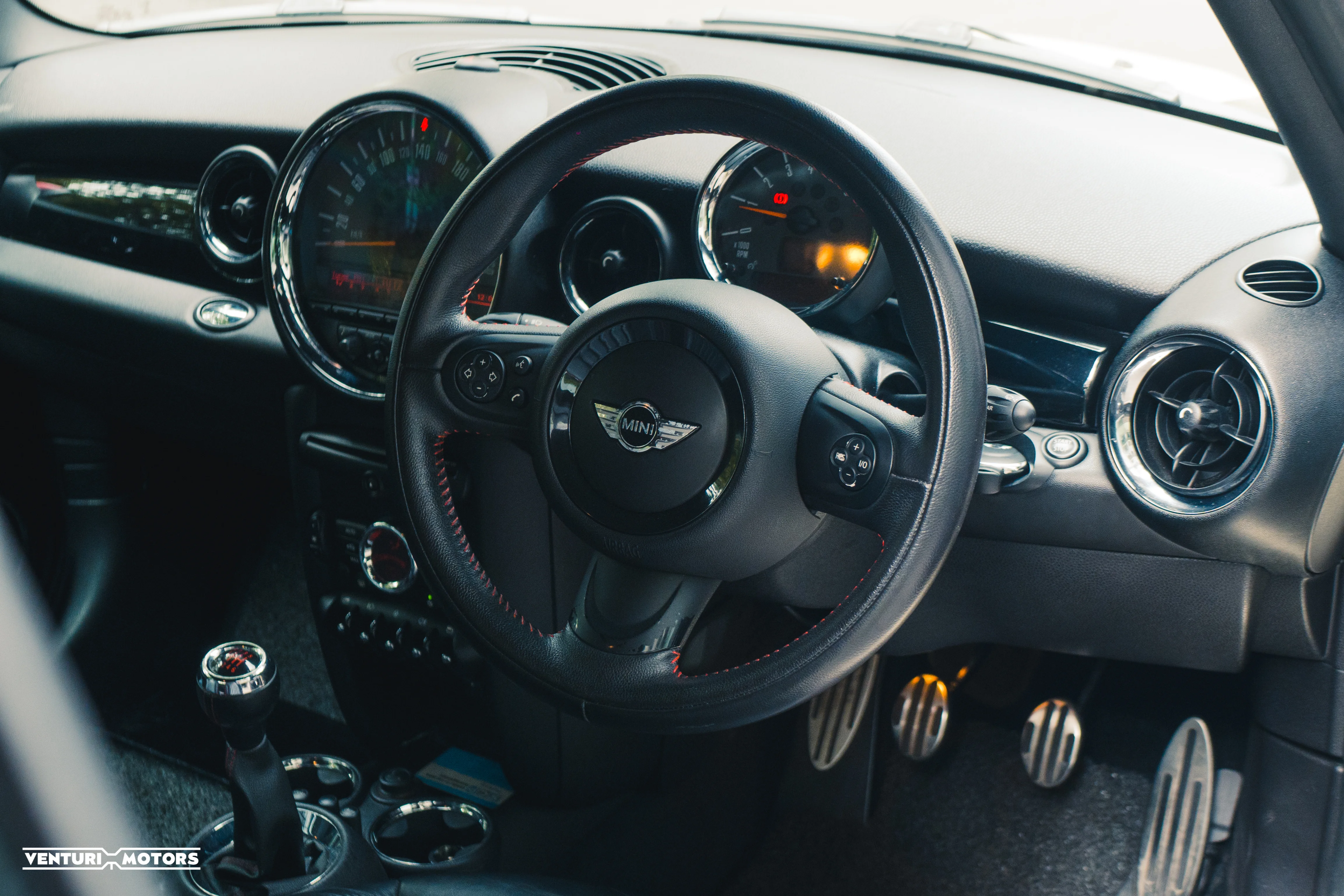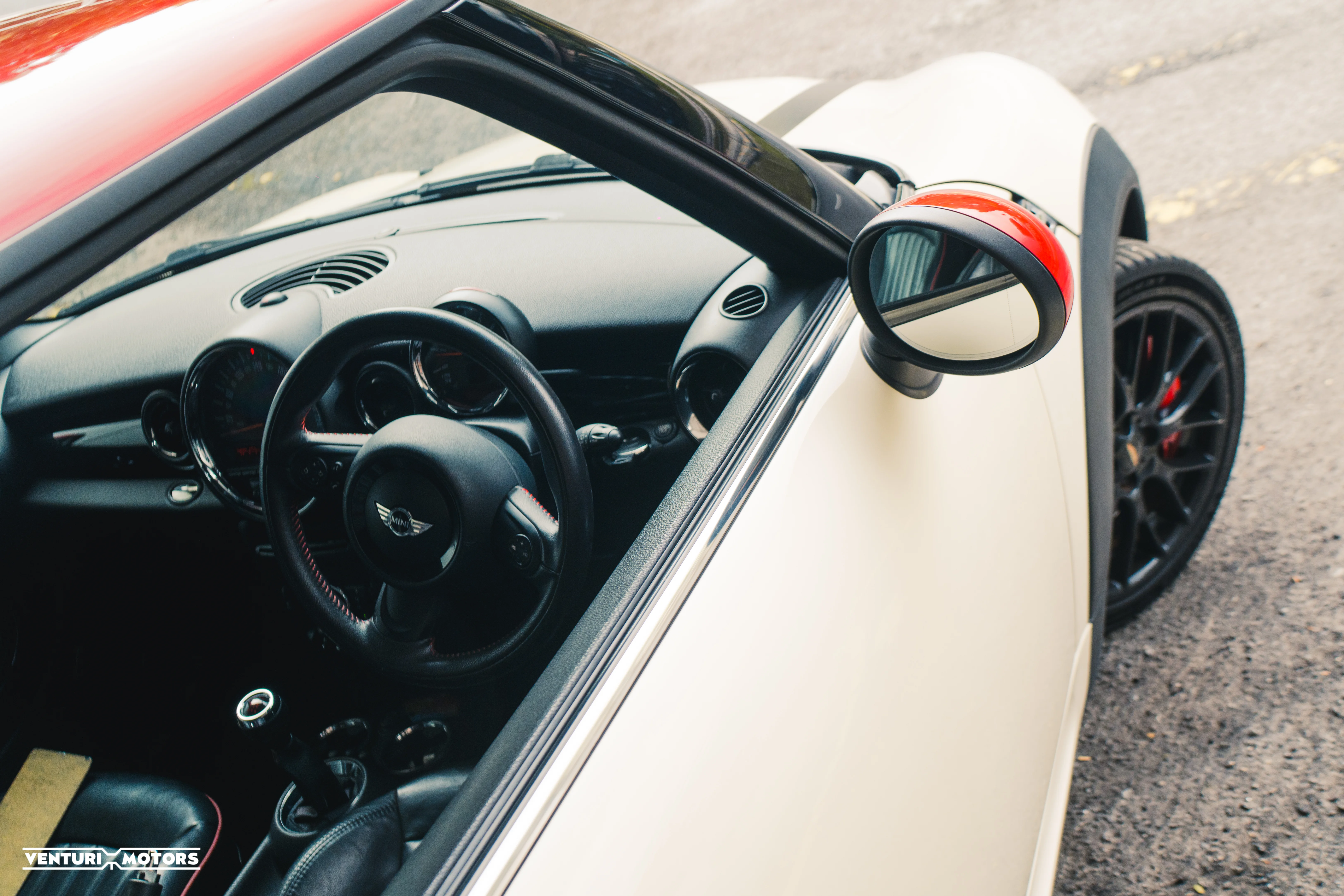 Inside, the cabin is trimmed in black leather with red piping, subtly reinforcing the JCW identity. The cockpit remains driver-focused and purposeful, balancing premium touches with a distinctly mechanical feel.