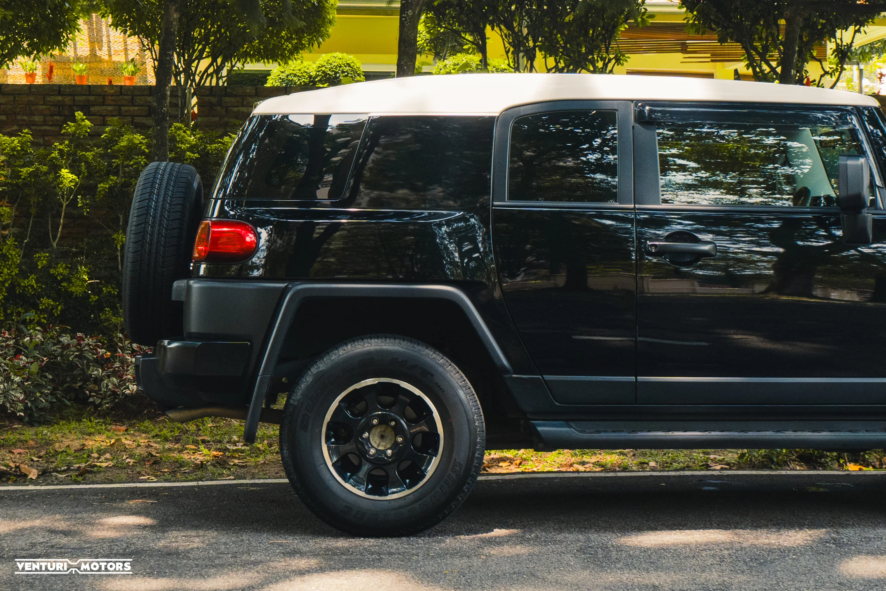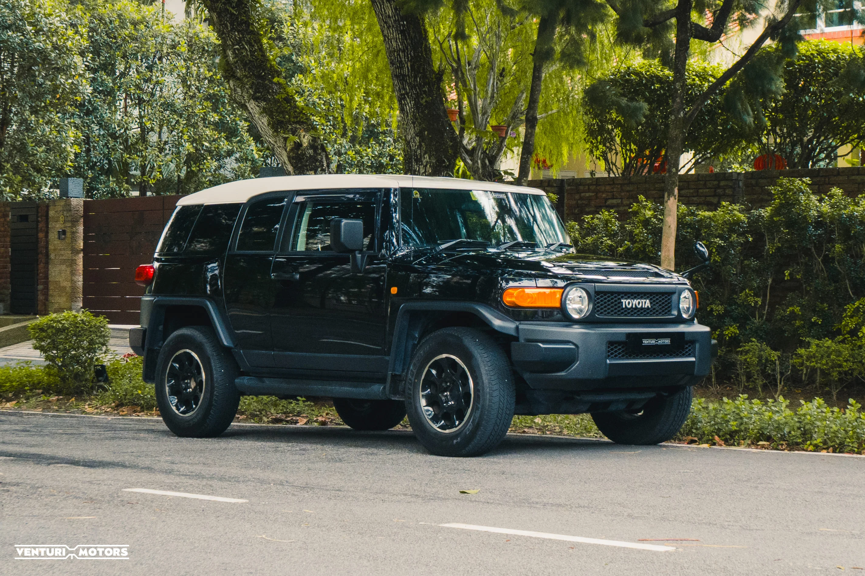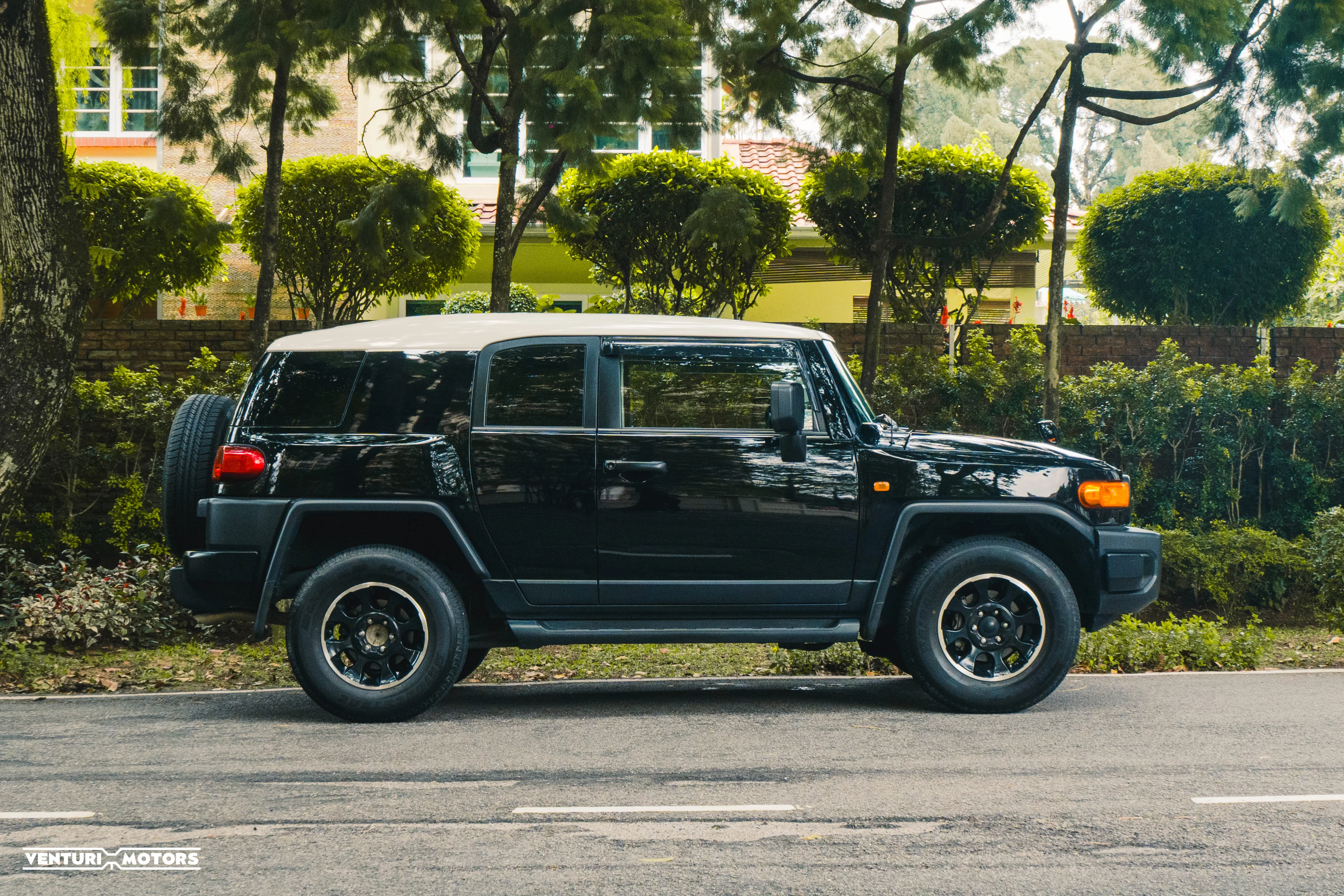 Finished in black with its signature white roof, the stance is unapologetically bold. Big arches, upright glass, short overhangs — everything about it says it’s ready. This example remains **completely bone stock**, preserving the original engineering and balance Toyota intended.